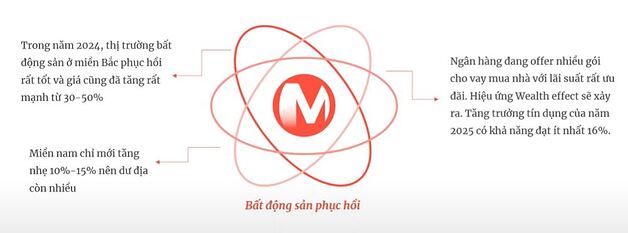 Trong năm 2024, lợi nhuận của ngành Bất động sản đã có dấu hiệu phục hồi rõ rệt, đặc biệt là tại khu vực miền Bắc, với mức tăng trưởng 30% – 40%. Bước sang năm 2025, kỳ vọng sẽ chuyển hướng sang khu vực miền Nam, khi mà mức phục hồi của khu vực này mới chỉ đạt khoảng 10% – 15%. Đồng thời, trong năm nay, nhiều dự án mới sẽ được mở bán, tạo thêm động lực tăng trưởng cho cả ngành Bất động sản và Ngân hàng.