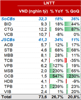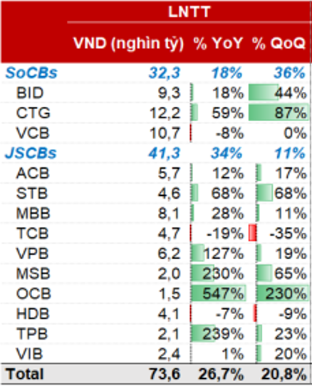 Bên cạnh một số mã có mức tăng đột biến như OCB (+547%), TPB (+239%) và MSB (+230%), thì Em đánh giá cao hơn những cổ phiếu có tăng trưởng ổn định và bền vững, điển hình như: VPB: Tăng trưởng 127% LNTT; STB: Ghi nhận mức tăng 68%; CTG: Tăng trưởng 59%.
