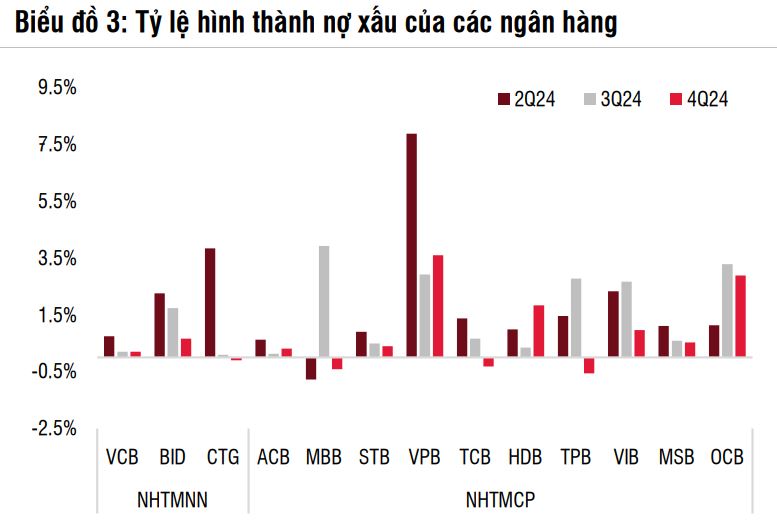 Ở đây, em muốn giới thiệu đến Anh Chị một biểu đồ quan trọng nữa, đó là biểu đồ tỷ lệ hình thành nợ xấu của các ngân hàng trong năm 2024.