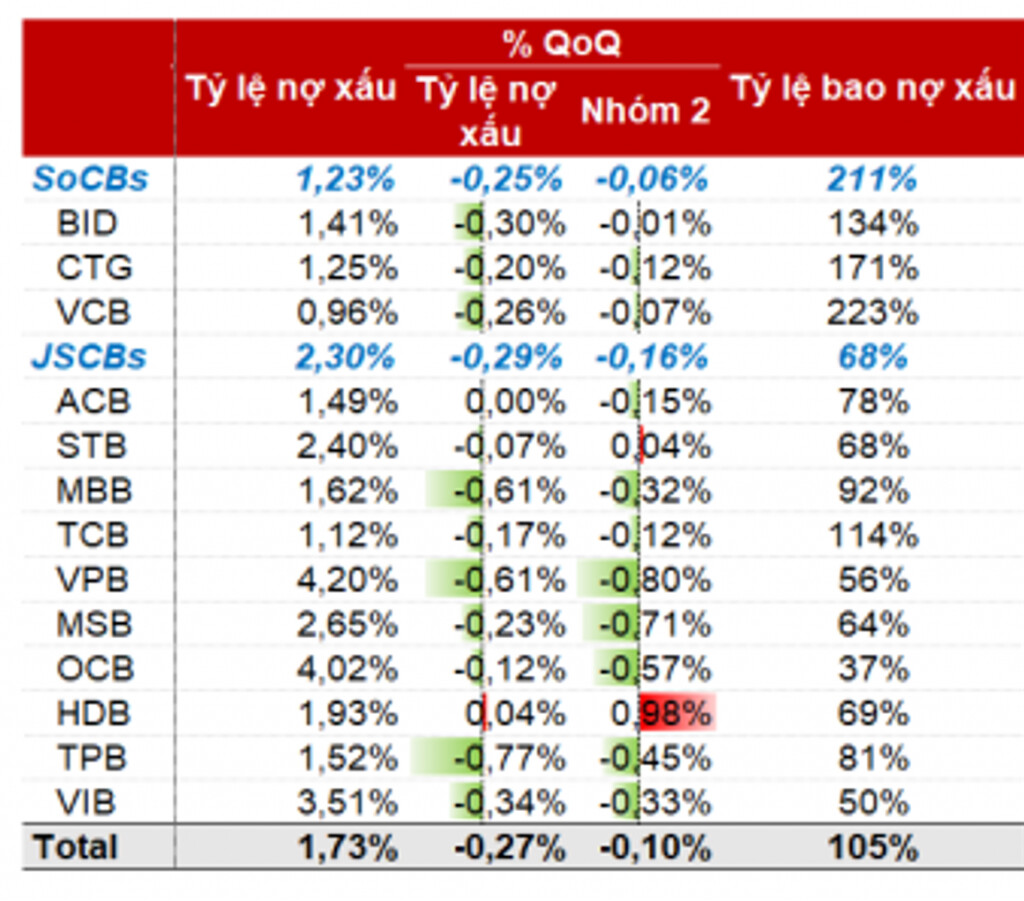 Trong đó, các ngân hàng có tỷ lệ nợ xấu thấp và kiểm soát rủi ro tốt nhất bao gồm: VCB (Vietcombank); TCB (Techcombank); CTG (VietinBank); MBB (MB Bank)
