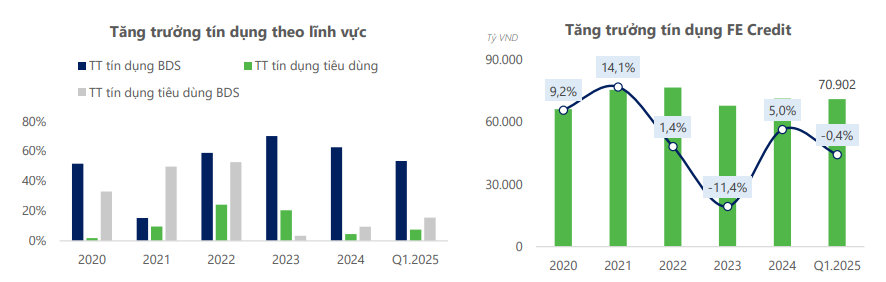 FE Credit hầu như không có đóng góp vào tăng trưởng tín dụng Q1.2025 khi tổng dư nợ cho vay không tăng trưởng so với đầu năm do vẫn đang trong quá trình tái cơ cấu các khoản cho vay, đồng thời nhu cầu tín dụng tiêu dùng vẫn chưa hồi phục.