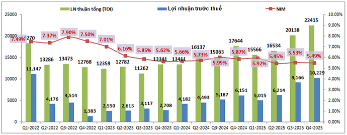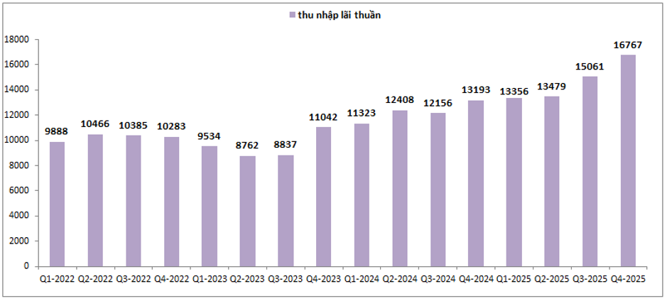 Mảng tín dụng của VPB ghi nhận mức tăng trưởng lớn trong năm 2025 về cả thu nhập lãi thuần cũng như tăng trưởng tín dụng. Cụ thể thu nhập lãi thuần đã liên tục gia tăng trong năm 2025 dù cho NIM suy giảm. Sau năm 2024 có phần chững lại thì thu nhập lãi thuần đã bắt đầu tăng lên để hướng lên các mức cao hơn nữa trong tương lai. Cuối Q4-2025 thu nhập lãi thuần của ngân hàng đã đạt 16,767 tỷ đồng, tăng 27% yoy. (Hình 2)