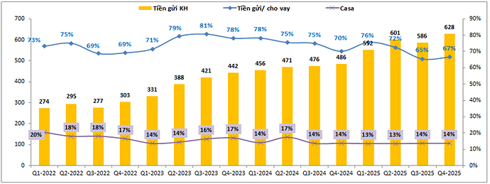 Trong Q4-2025 dù cho vay tăng mạnh nhưng tiền gửi khách hàng cũng tăng tương ứng và thậm chí có phần tốt hơn so với tăng trưởng cho vay. Cụ thể tiền gửi khách hàng cuối Q4-2025 đạt 628 tỷ đồng, tỉ lệ tiền gửi/cho vay đã tăng từ 65% cuối Q3 lên 67% vào cuối Q4. (Hình 4)
