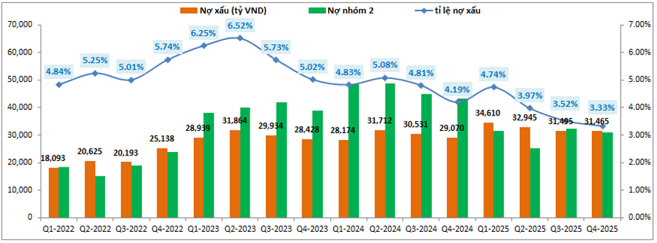 Cụ thể tỉ lệ nợ xấu từ mức đỉnh 6.52% vào Q2-2023 đã giảm xuống chỉ còn 3.33% vào cuối Q4-2025, tức đã giảm tới một nửa. So với đầu năm 2025, tỉ lệ nợ xấu cũng ghi nhận giảm 0.86%. Ngoài ra nợ nhóm 2, nhóm nguy cơ hình thành nợ xấu trong tương lai cũng duy trì ở mức nền thấp hơn khá nhiều so với 2024 và điều này giúp cho áp lực hình thành nợ xấu giảm bớt trong tương lai. Hiện tại VPB đã tái cấu trúc FE Credit thành công giúp cho nợ xấu giảm đi rất nhiều, cùng với đó là nghiệp vụ thu hồi nợ xấu cũng được đẩy mạnh trong thời gian qua vừa hỗ trợ lợi nhuận, vừa xử lý được bớt nợ xấu hình thành cho ngân hàng. Trong năm 2026 với việc duy trì tín dụng ở mức vừa phải sẽ giúp ngân hàng có thể tập trung vào chất lượng tài sản và qua đó có thể kỳ vọng tiếp tục giảm bớt tỉ lệ nợ xấu xuống quanh mức 3% và dưới 3%.