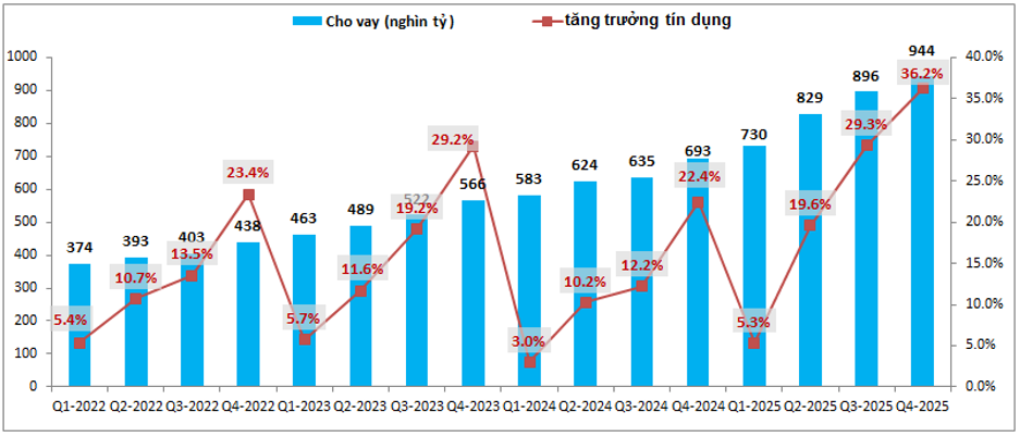 Động lực lớn hỗ trợ tăng trưởng tốt thu nhập lãi thuần của ngân hàng chính là tăng trưởng tín dụng ở mức rất cao. Tính hết năm 2025, tăng trưởng tín dụng của VPB đạt 36.2%, cao hơn khá nhiều 3 năm gần đây với lần lượt là 23.4, 29.2 và 22.4%. Đáng chú ý, trong Q4 dù lãi suất cho vay đã nhích tăng cũng như tín dụng toàn ngành có phần chững lại thì VPB vẫn duy trì được tăng trưởng tín dụng ở mức cao. (Hình 3)