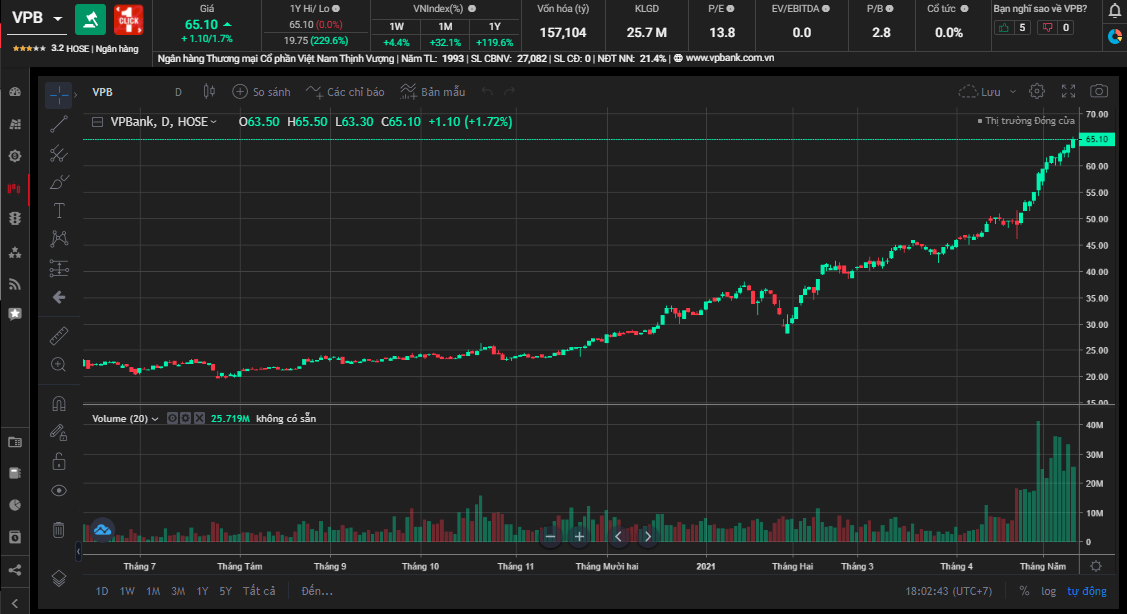 Cổ phiếu VPBank có màn trình diễn ấn tượng và đang là một trong những cổ phiếu nóng nhất nhóm ngân hàng. Kể từ đầu năm cổ phiếu này đã tăng giá gấp đôi, đóng cửa phiên giao dịch 14/5 ở mức giá 66.000 đồng/cp. Trong vòng một tháng trở lại đây, thanh khoản VPBank cũng ở mức “khủng”, riêng trong hôm nay khớp lệnh hơn 44,4 triệu đơn vị.