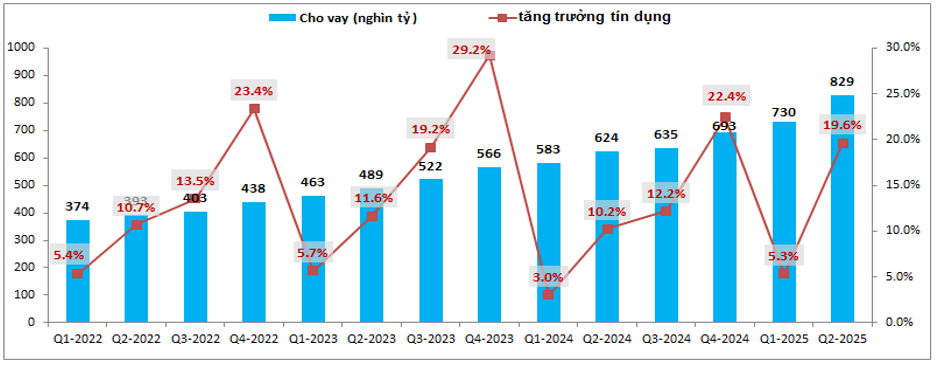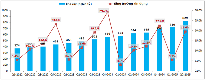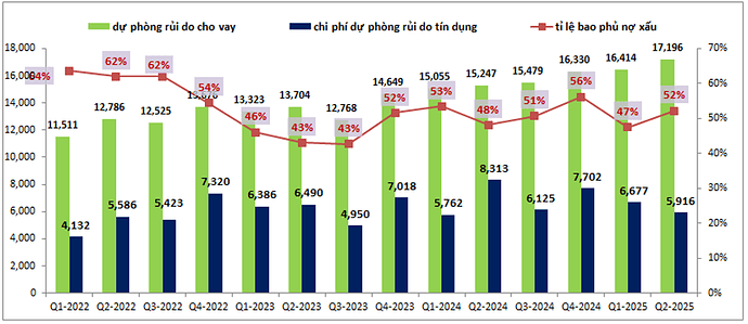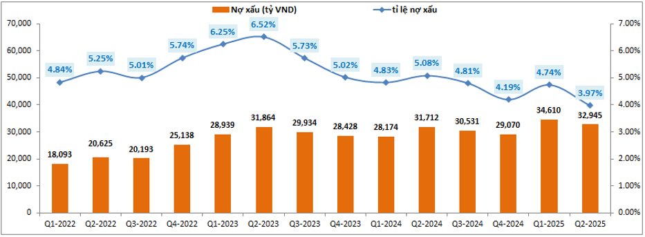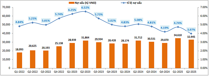 Bức tranh tài chính của VPB đang có xu hướng chuyển biến tốt lên khá nhiều trong 2 năm nay. Tỷ lệ nợ xấu của ngân hàng vẫn duy trì xu hướng giảm tốt khi đã giảm từ 6.52% vào Q2-2023 xuống chỉ còn 3.97% vào Q2-2025. Đây cũng là mức tỷ lệ nợ xấu thấp nhất từ đầu 2022 tới nay của VPB. (Hình 5)