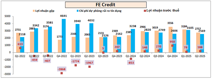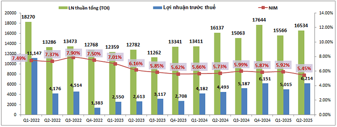 VPB đã công bố kết quả kinh doanh Q2-2025 khá tích cực với tổng lợi nhuận thuần (TOI) đạt 16,534 tỷ đồng, tăng 2.5% YOY. Lợi nhuận trước thuế đạt 6,214 tỷ đồng, tăng 38.3% YOY. (Hình 1)