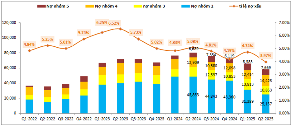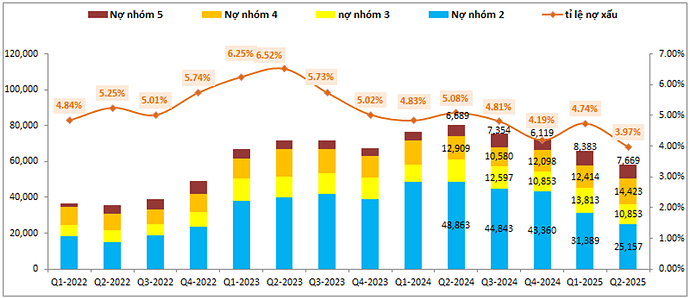 Bóc tách nợ xấu của ngân hàng theo từng nhóm nợ chúng ta có thể thấy đa phần các nhóm đều có xu hướng được cải thiện tốt sau các quý. Ngoài ra nợ nhóm 2 – nhóm có nguy cơ thành nợ xấu trong tương lai cũng giảm rất tốt dù TT02 đã hết hạn cuối 2024. Đến cuối Q2-2025 nợ nhóm 2 chỉ còn 25,157 tỷ đồng, giảm gần 20k tỷ đồng so với đầu năm. (Hình 6)