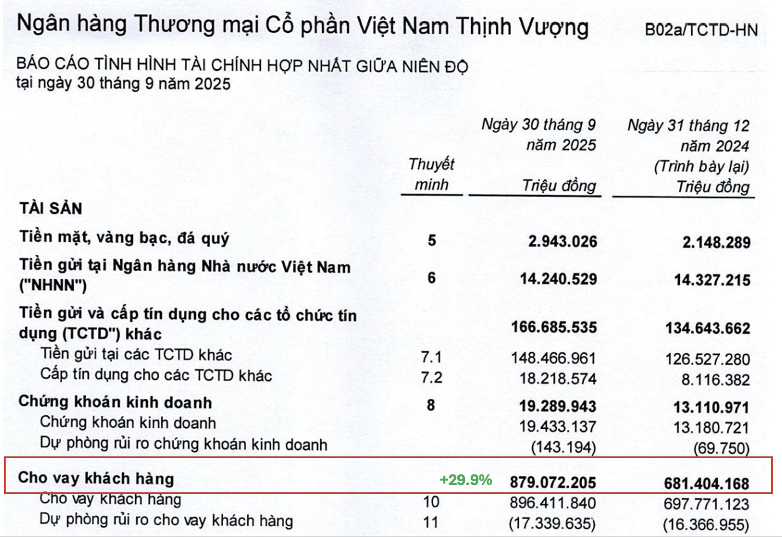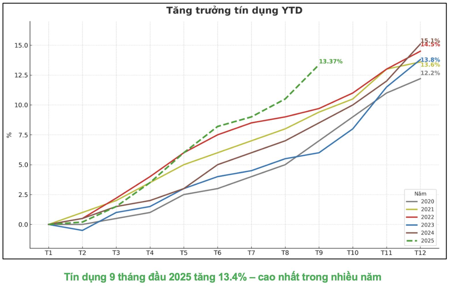 • Tăng trưởng tín dụng 9 tháng đầu năm 2025 đạt gần 30%, gần gấp đôi mức trung bình toàn ngành (14%).