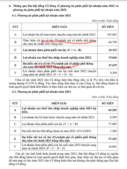 Theo biên bản thì dự kiến chia 12% bằng tiền trong năm 2023 phải không bác? bao gồm 7% (mục 6.1. B) cho năm tài chình 2021 và 5% (6.1.E) cho năm tài chính 2022.