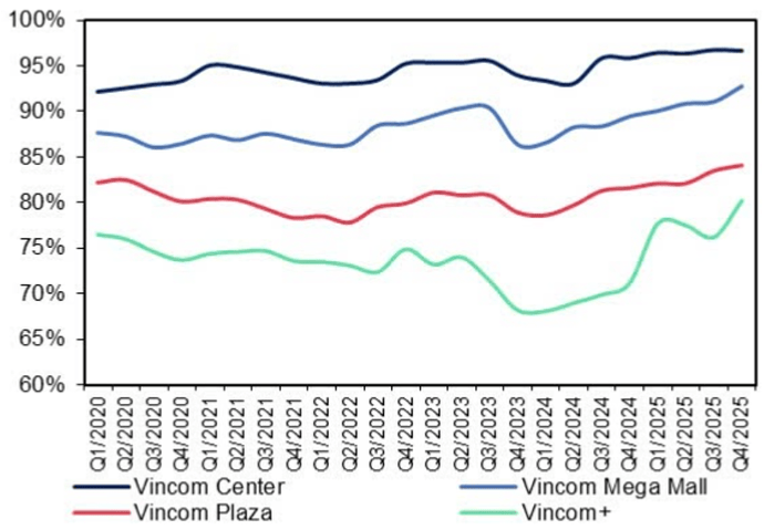 Bên cạnh định dạng truyền thống thì nhóm Vincom+ cũng đang có những chuyển biến tích cực. Trước đây, tỷ lệ nhóm này chỉ quanh 75% thì đến Q4/25 đã cán mốc 80%. Đây là nhóm có tỷ lệ lấp đầy thấp hơn, tuy nhiên tác động đến lợi nhuận từ hoạt động cho thuê là hạn chế do diện tích sàn trung bình dưới 4.000m2 – một con số tương đối nhỏ so với mặt bằng chung của TTTM. Chúng tôi kỳ vọng tỷ lệ của nhóm này sẽ dần được cải thiện khi dư địa còn khá nhiều. (Hình 3)
