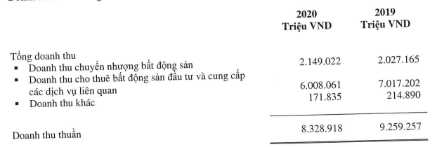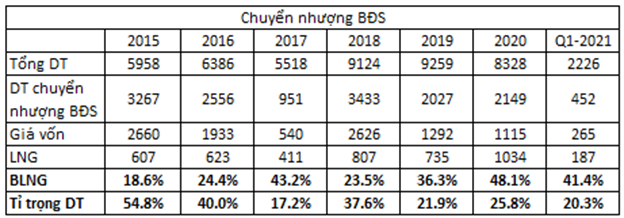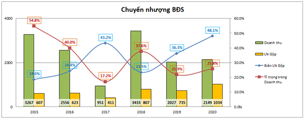 Trong năm 2020 doanh thu chuyển nhượng BĐS chủ yếu đến từ việc bàn giao một số dự án Shophouse như Mỹ Tho, Bạc Liêu, Cẩm Phả, Sóc Trăng, Kon tum,…