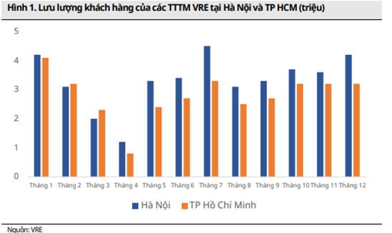 Ngành bán lẻ trong năm 2020 đã chịu rất nhiều khó khăn từ dịch covid 19, nhưng khi mà dịch bệnh dần được kiểm soát và vắc xin được đẩy mạnh tiêm chủng cũng giúp kỳ vọng các doanh nghiệp trong ngành hồi phục mạnh mẽ. Trong khó khăn, các doanh nghiệp lớn cũng tận dụng để chiếm thêm thị phần từ các doanh nghiệp nhỏ có nền tảng tài chính kém hơn. Sau 2 tháng 3 và 4 giãn cách xã hội thì lưu lượng khách hàng quay trở lại trung tâm thương mại của VRE đã tăng trưởng khá tốt là tín hiệu mừng cho doanh nghiệp. Cụ thể như hình 3 dưới đây