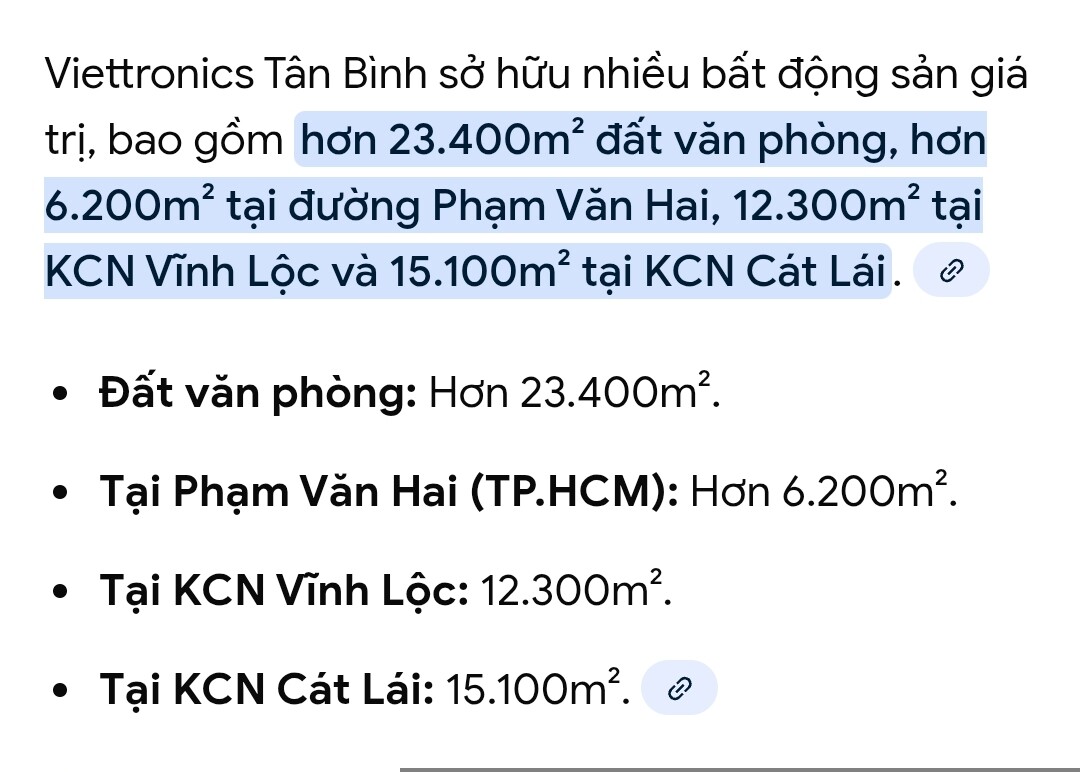 - Phát triển Bất động sản Công nghiệp/Thương mại: Viettronics Tân Bình sở hữu nhiều khu đất có giá trị lớn tại TP. Hồ Chí Minh (Phạm Văn Hai, KCN Vĩnh Lộc, KCN Cát Lái). Geleximco, với kinh nghiệm mạnh về bất động sản, có thể hỗ trợ VTB khai thác các khu đất này để phát triển các dự án có giá trị cao hơn, tạo nguồn thu đột biến để tái đầu tư vào sản xuất, kinh doanh cốt lõi.