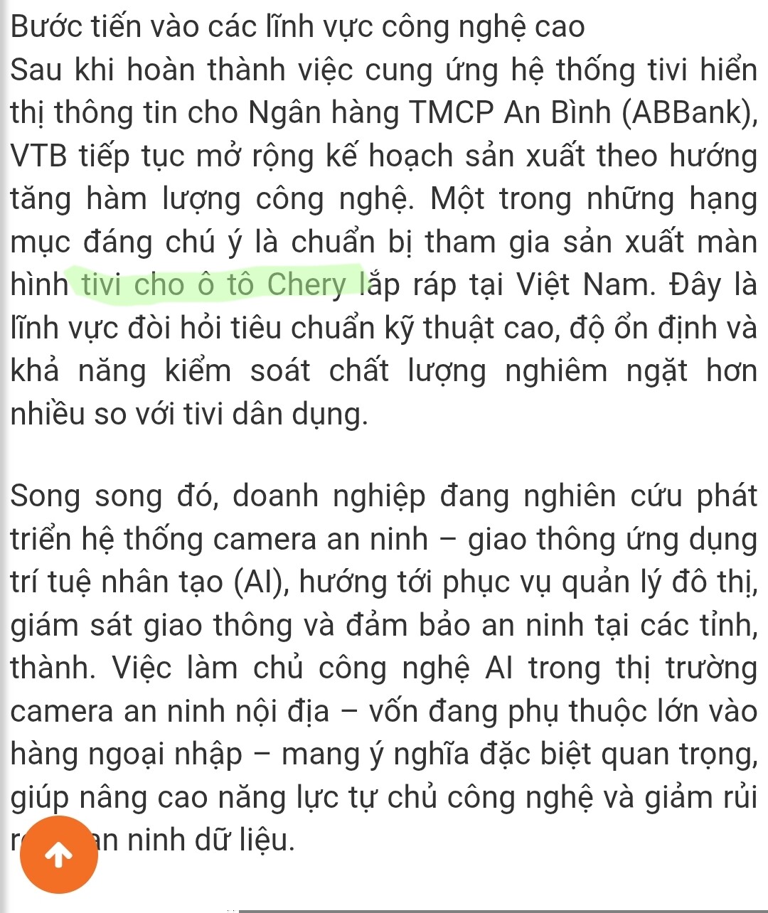 - Sản xuất Màn hình Ô tô: VTB đang chuẩn bị tham gia sản xuất màn hình tivi (giải trí) cho ô tô Chery lắp ráp tại Việt Nam. Đây là một lĩnh vực đòi hỏi tiêu chuẩn kỹ thuật, độ ổn định và kiểm soát chất lượng rất nghiêm ngặt.