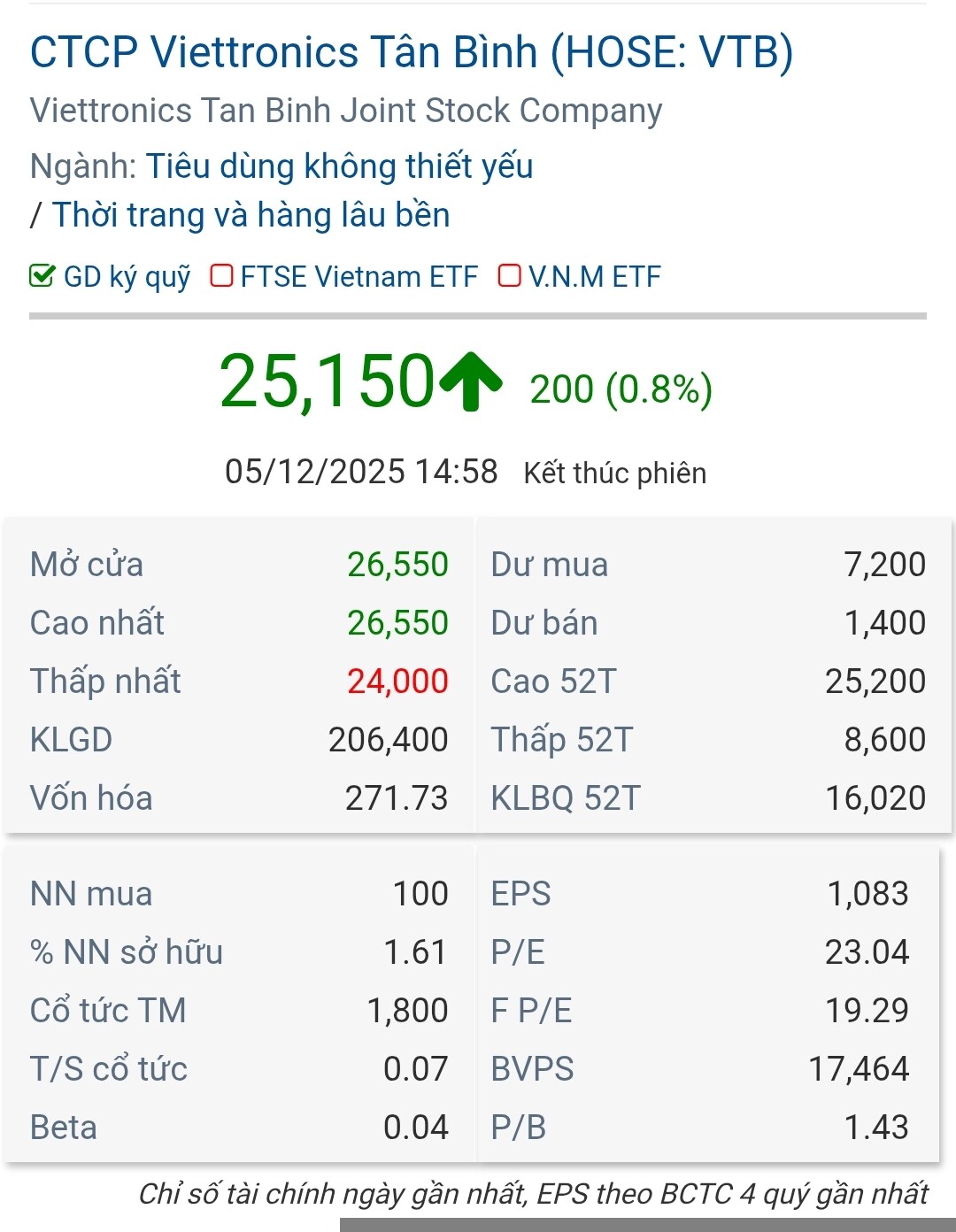 | Chỉ Tiêu | Viettronics Tân Bình (VTB) | Viettronics (VEC) (Công ty Mẹ) | Đánh Giá Tương Đối |