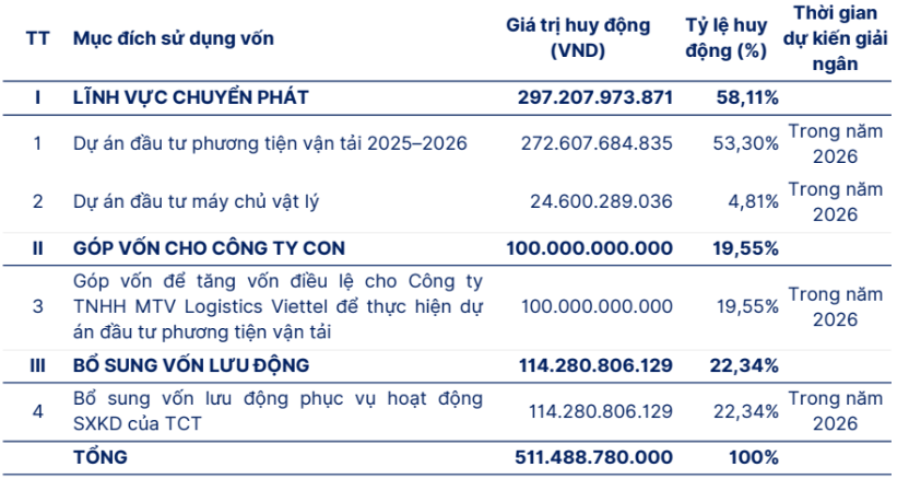 Toàn bộ số tiền thu được từ đợt chào bán (dự kiến 511,5 tỷ đồng) dự kiến sẽ được Viettel Post sử dụng hơn 297 tỷ đồng cho lĩnh vực chuyển phát. Trong đó, đầu tư vào dự án đầu tư phương tiện vận tải 2025 -2026 gần 273 tỷ đồng và 24,6 tỷ đồng đầu tư máy chủ vật lý. (Hình 3)