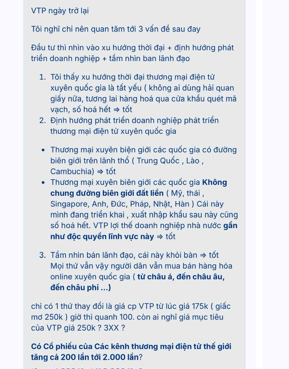 chỉ có 1 thứ thay đổi là giá cp VTP từ lúc giá 175k ( giấc mơ 250k ) giờ còn ai ?. còn ai nghĩ giá mục tiêu của VTP giá 250k ? 350K