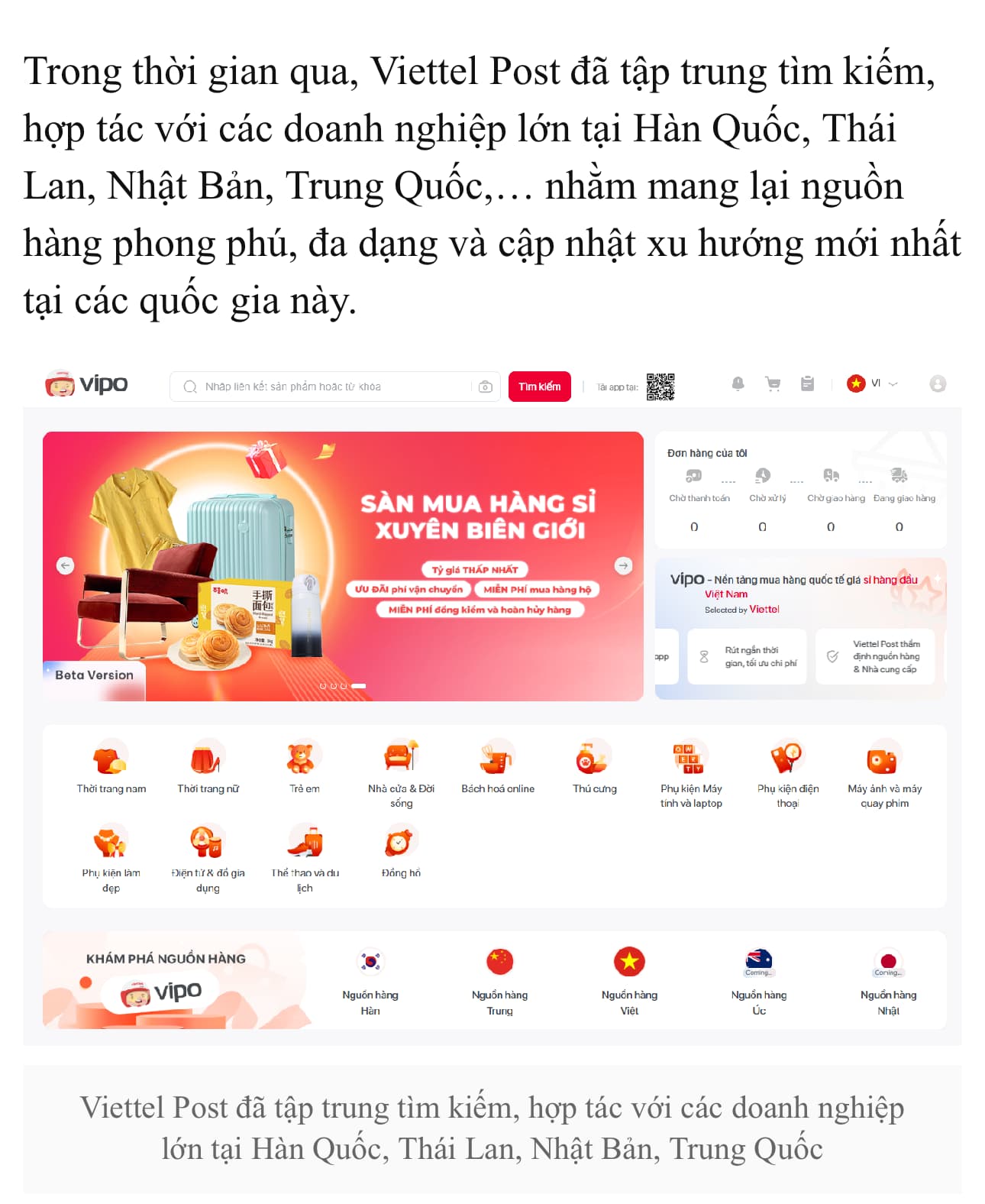 Ngoài ra, Viettel Post đang thử nghiệm dự án Vipo Mall nhằm phục vụ doanh nghiệp vừa và nhỏ (SME) mua hàng sỉ,