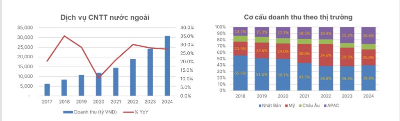 Mảng dịch vụ CNTT cho thị trường nước ngoài tiếp tục là động lực chính cho tăng trưởng dù có thể chịu tác động gián tiếp từ chính sách thuế đối ứng gần đây của Mỹ. Hoạt động của FPT ít chịu tác động trực tiếp bởi chính sách này do đối tượng nhắm đến hiện chủ yếu là hàng hóa, ngoài ra một phần các dịch vụ cung ứng cho khách hàng được thông qua các công ty con bản địa như Intellinet, Intertec.