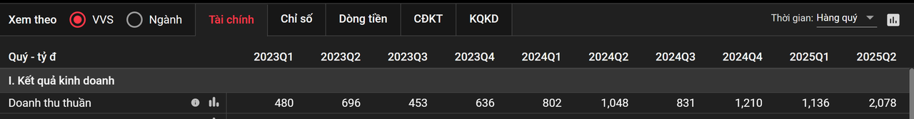VVS là doanh nghiệp có mức tăng Doanh thu và lợi nhuận đều đặn từ lúc lên sàn tới nay. Giai đoạn 2022-2023 doanh thu nhiều quý chỉ ở mức hơn 400 tỷ đồng hiện tại quý 2 Doanh thu đạt đến hơn 2000 tỷ đồng (một mức tăng trưởng thần kỳ). Kéo theo đó là 1 mức tăng trưởng lợi nhuận kỷ lục hơn 55 tỷ. Hiện tại với mức LN/quý so với vốn hoá gần 800 tỷ thì VVS xứng đáng được xem xét lại về giá trị.