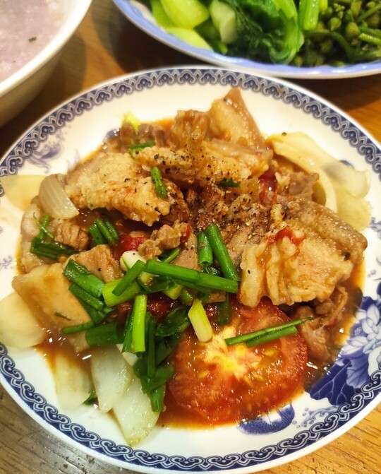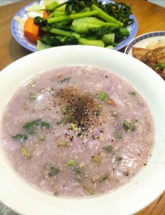 Hôm nay trời mưa em lại nấu canh khoai tím và thịt ba chỉ sốt cà chua cho vợ.