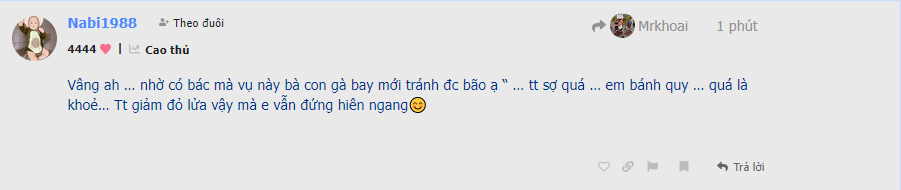 Vâng ah … nhờ có bác mà vụ này bà con gà bay mới tránh đc bão ạ “ … tt sợ quá … em bánh quy … quá là khoẻ… Tt giảm đỏ lửa vậy mà e vẫn đứng hiên ngang😊