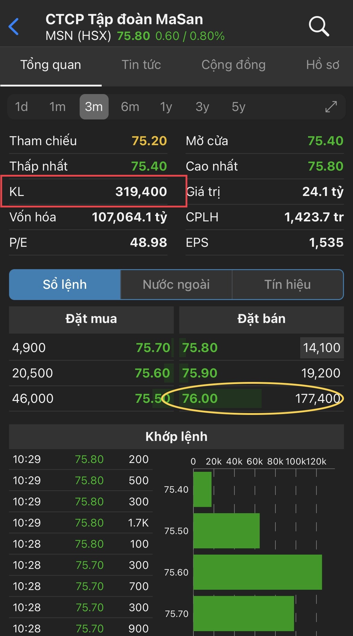 Cổ phiếu MSN có Khối Lượng Đặt Bán là 177,400 cổ với mức giá 76, trong khi KL khớp lệnh hiện tại là 319k.