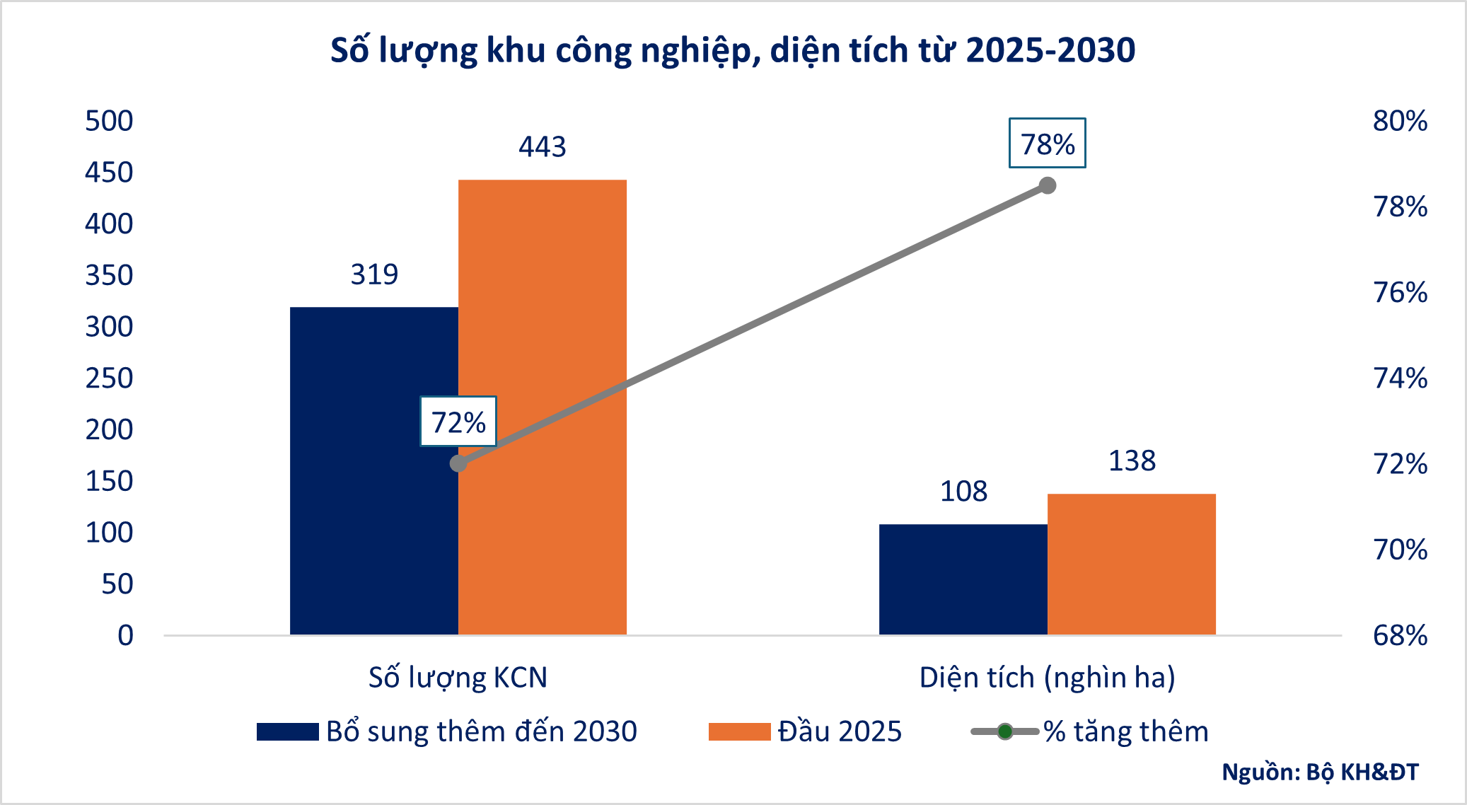 Tỷ lệ lấp đầy khu công nghiệp hiện tại đang ở mức cao: 80% tại miền Bắc và 89% tại miền Nam. Trong khi đó, theo quy hoạch đến năm 2030, sẽ có thêm 319 khu công nghiệp mới – tăng 72% so với hiện tại. Đây là tín hiệu rõ ràng cho thấy nhu cầu xây dựng khu công nghiệp sẽ tiếp tục tăng mạnh.