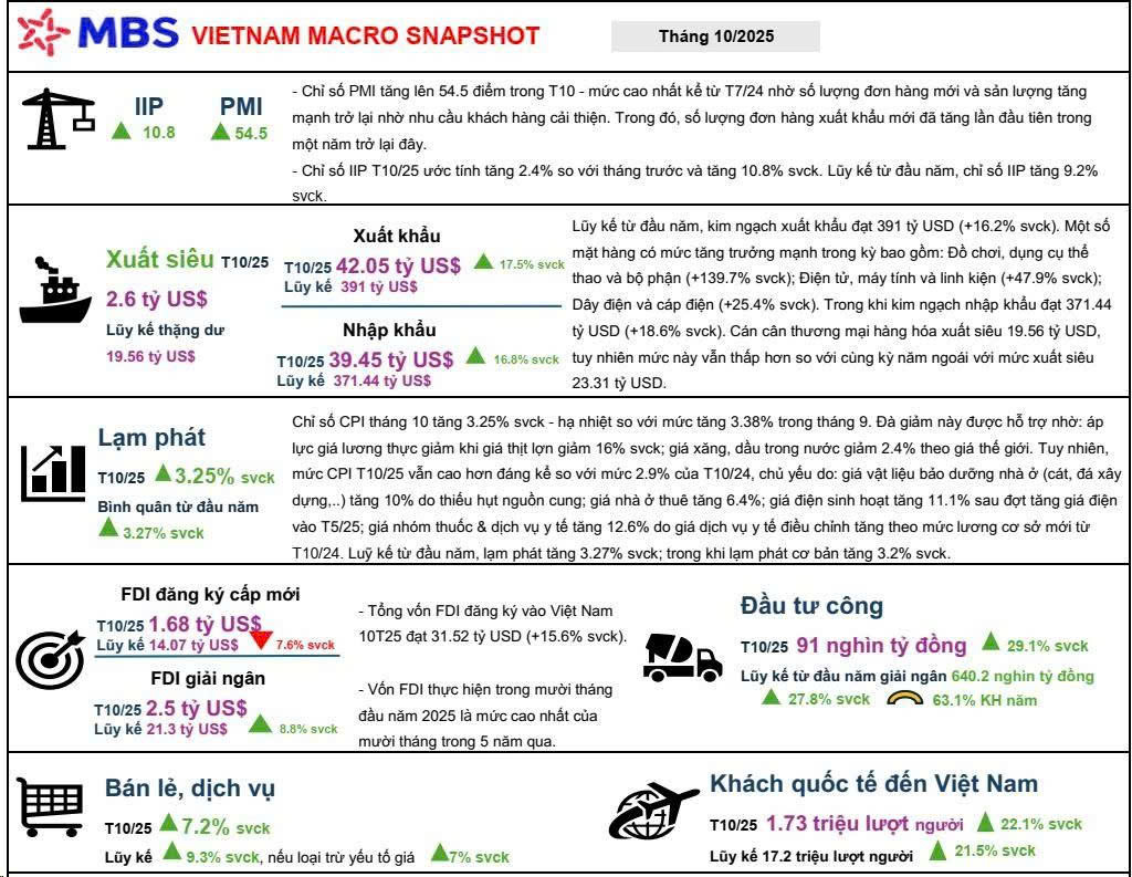 Với PMI sản xuất 54,5 điểm, FDI đăng ký mới tăng 24,2% trong tháng 10 và giải ngân đầu tư công đạt 640,2 nghìn tỷ đồng (+29,1%), nền tảng vĩ mô đang ủng hộ VN-Index tiếp tục hành trình chinh phục đỉnh mới.